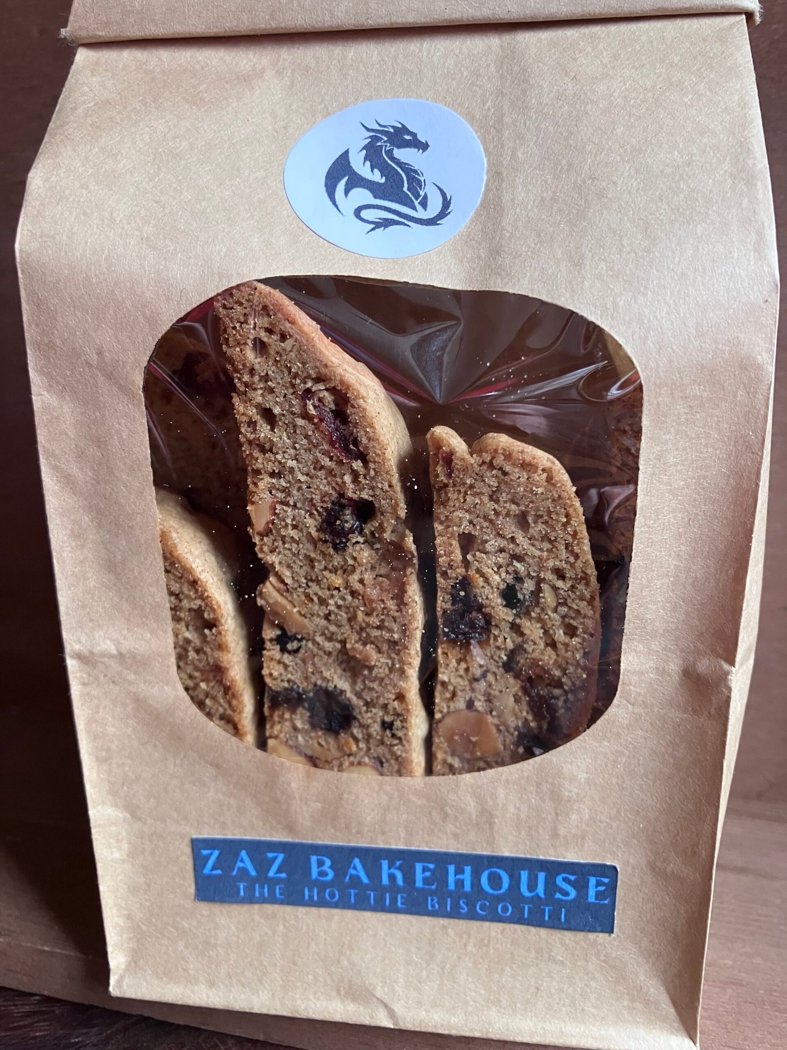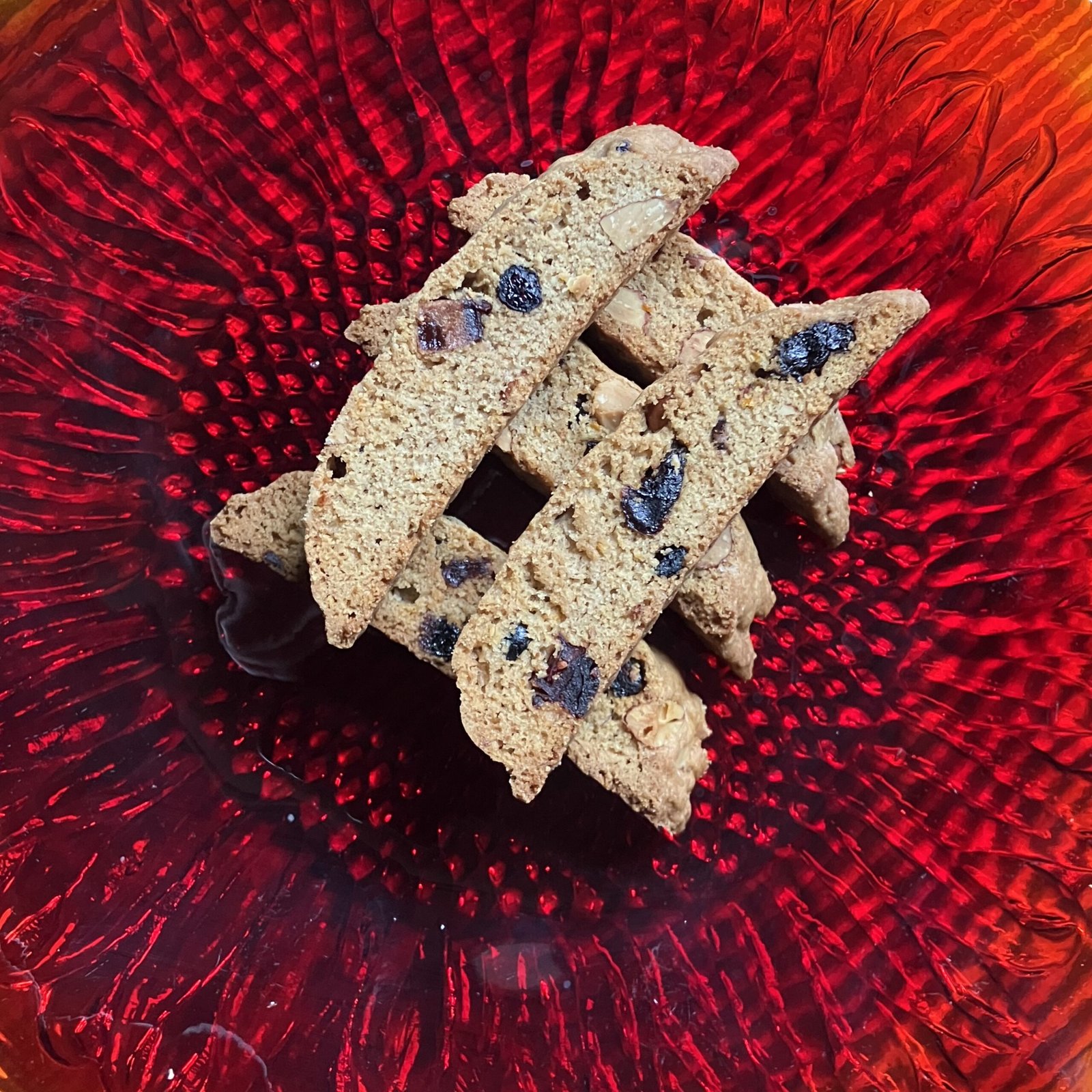 Ingredients: Unbleached Wheat Flour (Unbleached Hard Red Wheat Flour, Enzyme), Cane Sugar, Butter, Egg, Smoked Almonds (Almonds, Vegetable Oil, Salt, Corn Maltodextrin, Torula Yeast, Onion Powder, Yeast Extract, Gum Arabic, Canola Oil, Molasses, Sugar, Natural Mesquite Smoke Flavor, Spice), Dried Cherries (Cherries, Sugar, Sunflower Oil), Dried Cranberries (Cranberries, Sugar, Sunflower Oil), Dried Blueberries (Dried Blueberries, Cane Sugar, Sunflower Oil), Spice, Baking Powder (Corn Starch, Sodium Bicarbonate, Sodium Aluminum Sulfate, Monocalcium Phosphate), Vanilla Extract (Vanilla Bean Extractives In Water, Alcohol), Orange Zest, Salt